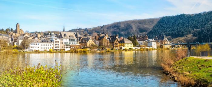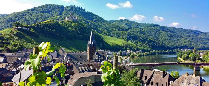 Du glider sedan längs Mosel, förbi lugna vingårdar, pittoreska korsvirkesbyar och branta sluttningar där några av Europas bästa Riesling viner frodas.