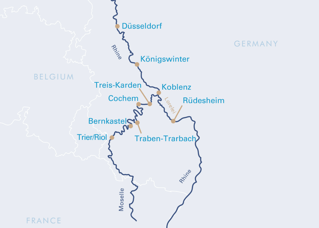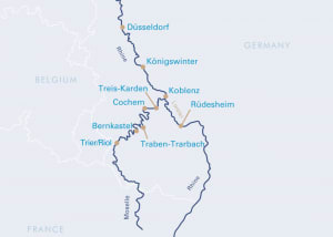 I Treis-Karden kan du njuta av Mosels speciella charm och Rüdesheim lockar besökare med sin berömda Drosselgasse. Sist väntar ett besök i charmiga Königswinter innan ni är åter i Düsseldorf.