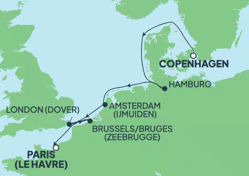 Ni kommer bl.a. besöka vackra och pulserande Hamburg, Amsterdam, London, Bryssel och sist men inte minst Paris där ni också kliver av fartyget (förlängning möjlig)!