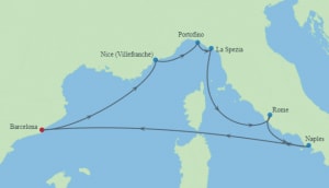Ni börjar resan med 1 natt i mysiga Barcelona. Ni kliver sedan ombord detta otroliga fartyg och kryssar till vackra destinationer såsom ex. Nice, Florens, Rom, Portofino, Neapel och Mallorca (Resrutt kan variera).