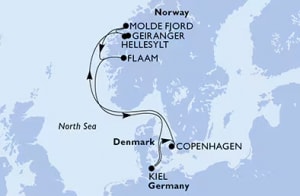 Underbara stopp väntar såsom Hellesylt, Geiranger, Molde, Flaam (samt Kiel i Tyskland).