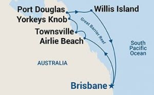 På denna 8 nätters drömkryssning får ni uppleva det bästa av Queensland Australien såsom Stora Barriärrevet, Willis Island, Port Douglas, Yorkeys Knob, Townsville och Airlie Beach. Här väntar kritvita stränder, färgrika korallrev, tropisk regnskog och spektakulära naturupplevelser!