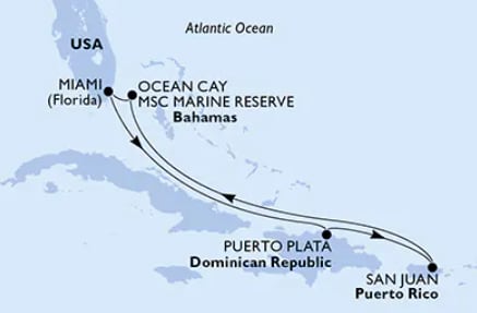 Sedan kliver ni ombord på en 7 nätters All Inclusive drömkryssning med moderna och nya MSC World America som tar er ut till nya spännande och exotiska destinationer nästan varje dag såsom Dominikanska Republiken, Puerto Rico och Ocean Cay MSC Marine Reserve, rederiets egna ö i vackra Bahamas!