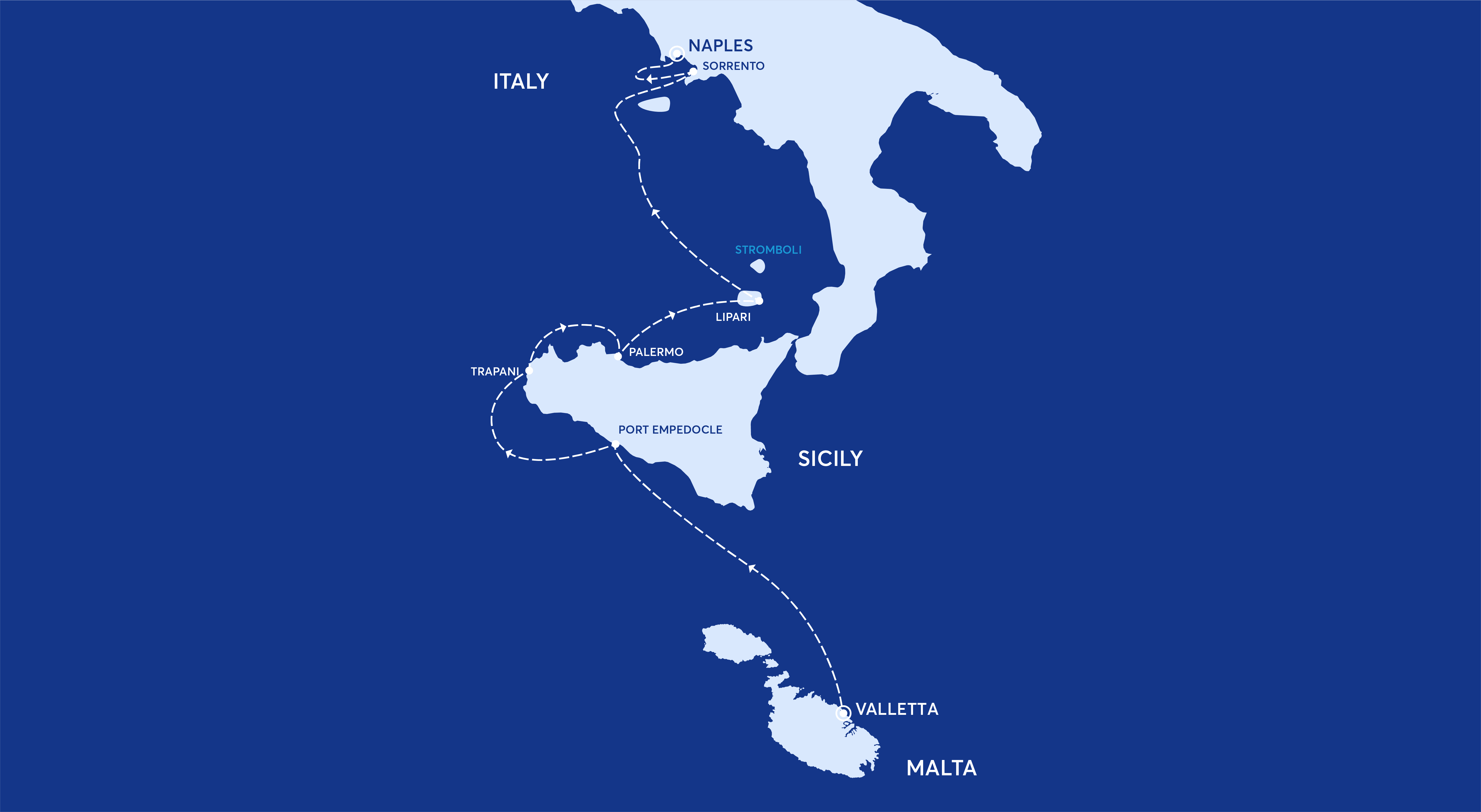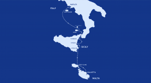 Valletta – Port Empedocle – Trapani – Palermo – Lipari – Sorrento – Neapel