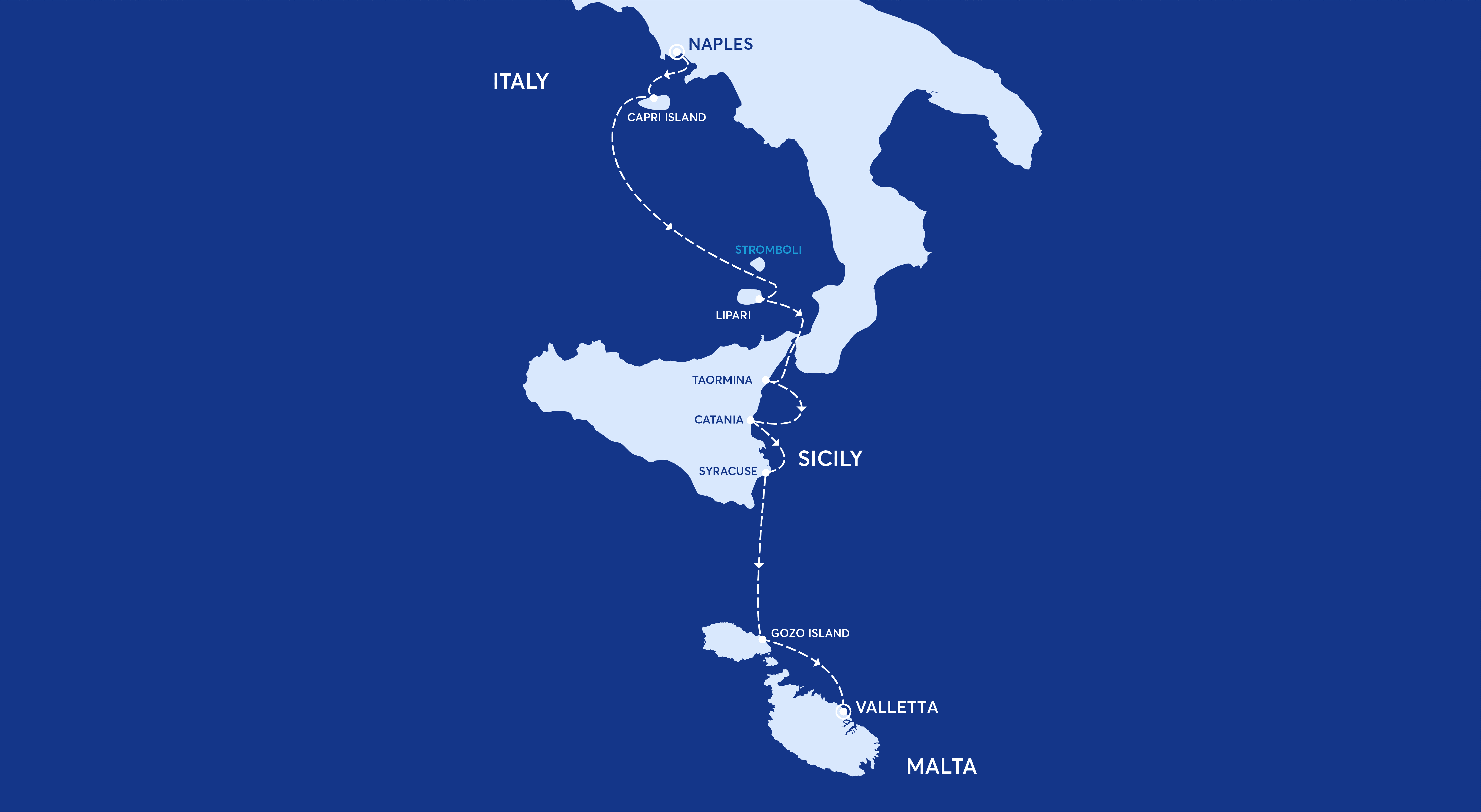 Resrutt 1 erbjuder stopp på vackra Capri och Lipari samt sagolika stopp på Sicilien såsom Taormina, Catania och Syrakusa samt Gozo och Valletta på Malta.